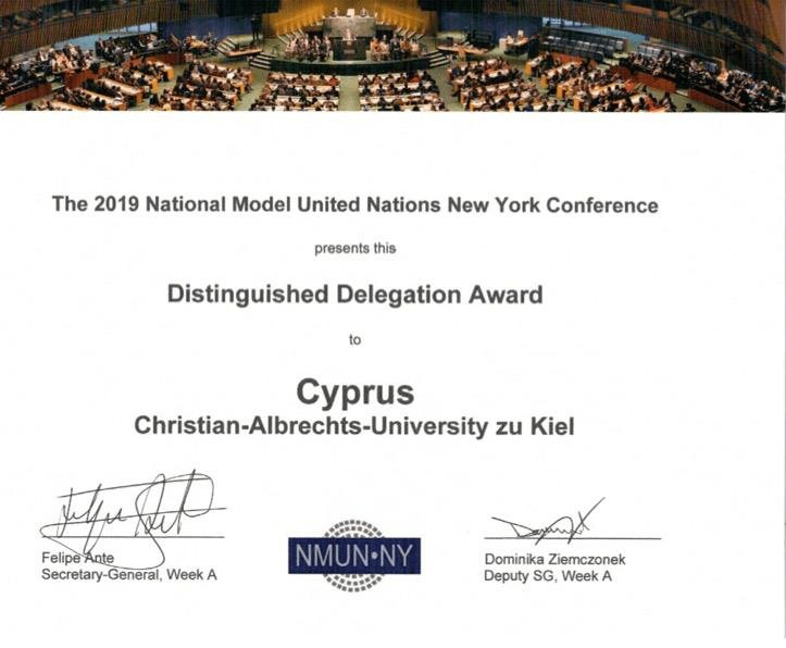Die Kieler Delegation 2019 hat Zypern vertreten und war mit insgesamt 20 Delegates in 8 Komittees vertreten. Erfolgreich hat sie einen Distinguished Delegation Award gewonnen, außerdem einen Position Paper Award für die General Assembly 3.